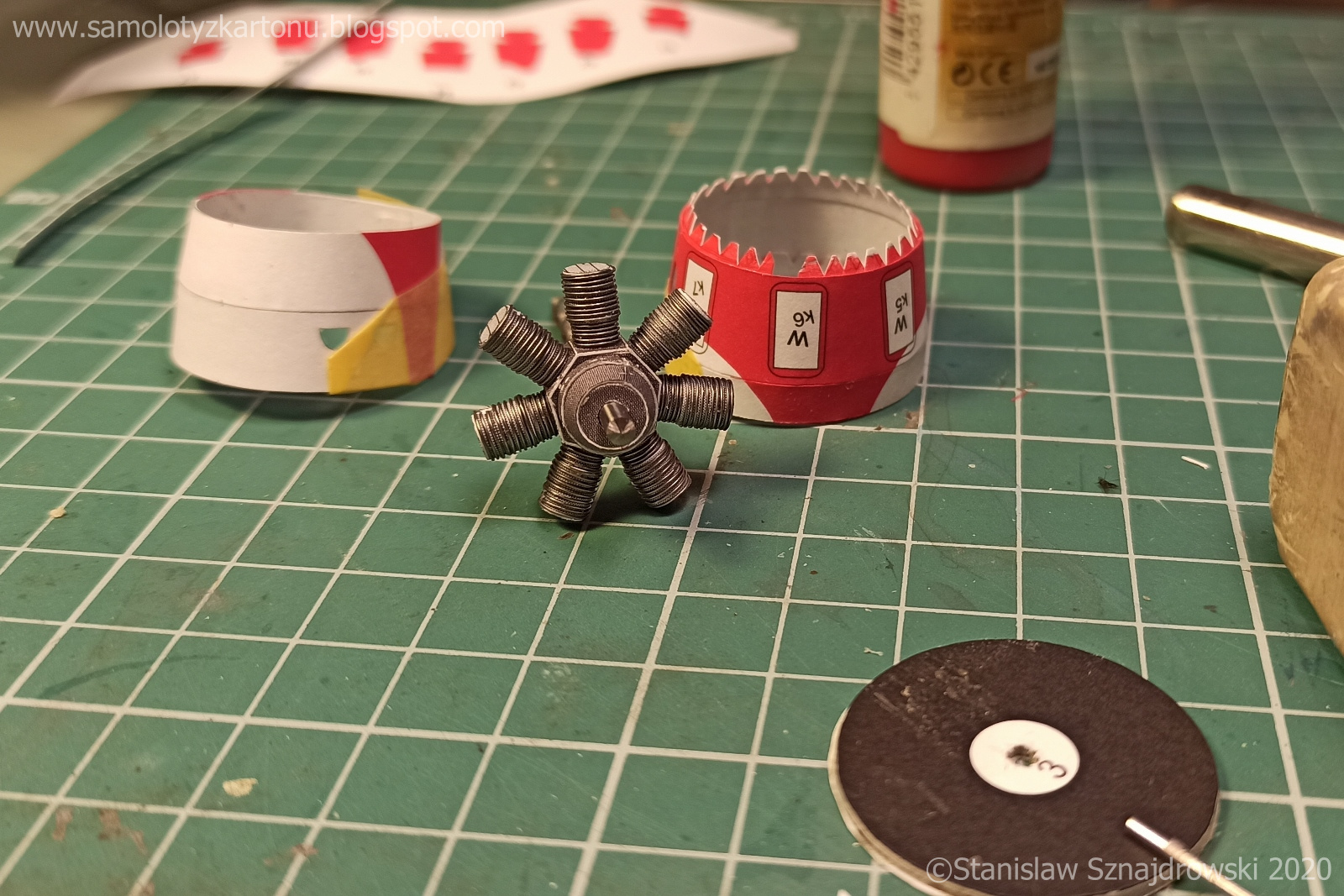 | Sklejenie centralnej części silnika wraz z cylindrami nie sprawiło najmniejszych kłopotów. Cylindry owinąłem drutem cynowym 0,2 mm, tak aby uzyskać imitację żebrowania. Całość będzie docelowo i tak malowana. Następnie zabrałem się za najbardziej intrygującą część, mianowicie układ wydechowy. Jest on dość osobliwy ze względu na umieszczenie go od frontu, a nie od tyłu. Najpierw, z elementów dostępnych w wycinance, wykonałem pierścień zbiorczy. Uplastyczniłem nieco jego przednią część masą modelarską, którą po wyschnięciu oszlifowałem. Kolejnym krokiem było wykonanie 7 rur odprowadzających spaliny z cylindrów do wspomnianego kolektora. Te musiałem już zrobić od podstaw. Jako materiału użyłem cienkiego papieru, z którego zwinąłem sobie trochę rurek długości około 2 cm i średnicy około 1,5 mm. Usztywniłem je klejem CA, a następnie poprzycinałem i posklejałem je tak, aby uzyskać odpowiednie kształty rur. Tak samo zrobiłem ze zbiorczą rurą wydechową, która odprowadza spaliny z pierścienia na zewnątrz. Swoją drogą, uważam, że ta pojedyncza, długa, wygięta w literę "S", zwisająca pod kadłubem rura jest urocza. | Glueing the central part of the engine with the cylinders did not cause any problems. I wrapped the cylinders with 0.2 mm tin wire in order to imitate the ribs. The whole thing will be painted anyway. Then I started the most intriguing part, namely the exhaust system. It is quite peculiar because it is placed at the front, not the rear. First, I made a collecting ring from the elements available in the cutout. I improved its front part a bit with a modelling putty and sanded it after drying. The next step was to make 7 exhaust pipes from the cylinders to the aforementioned collector. I had to do these pipes from scratch. As a material, I used thin paper, from which I rolled some tubes about 2 cm long and about 1.5 mm in diameter. I stiffened them with CA glue, then cut them and glued them together in order to obtain the appropriate shapes of the pipes. I did the same with the exhaust manifold, which discharges the exhaust gases from the ring to the outside. By the way, I found this single, long, S-bent pipe hanging under the fuselage to be cute. |